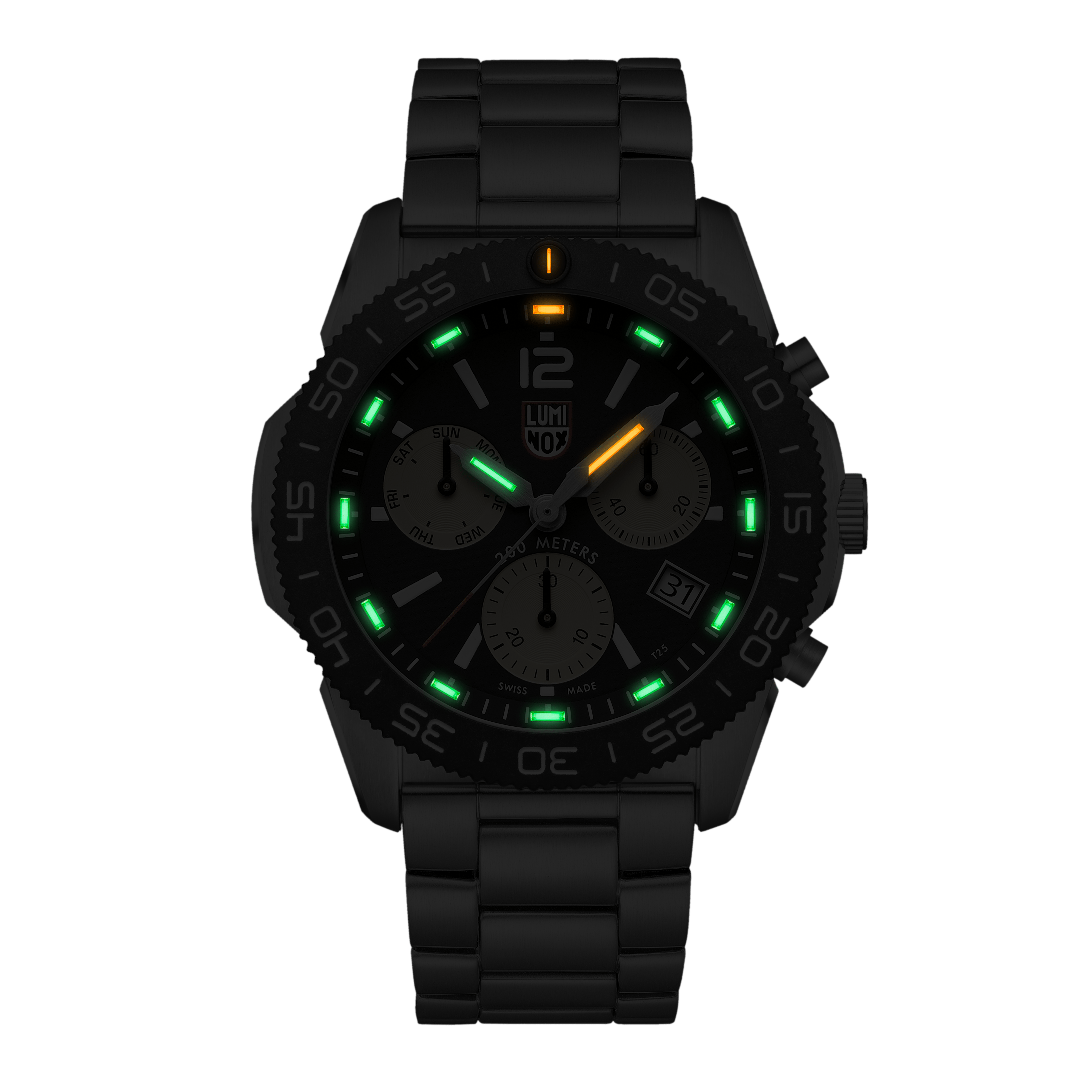 This sleek and sporty design boasts a 44mm stainless steel case with a CARBONOX™ unidirectional bezel, a vital instrument for any diver. The chronograph with a black dial and three sand-coloured sub dials features a 316L stainless-steel strap with a quick release system – allowing for an easy and perfect fit. As with every other Luminox timepiece, this Pacific Diver incorporates Luminox Light technology, making sure that your timepiece is visible in any condition for up to 25 years.